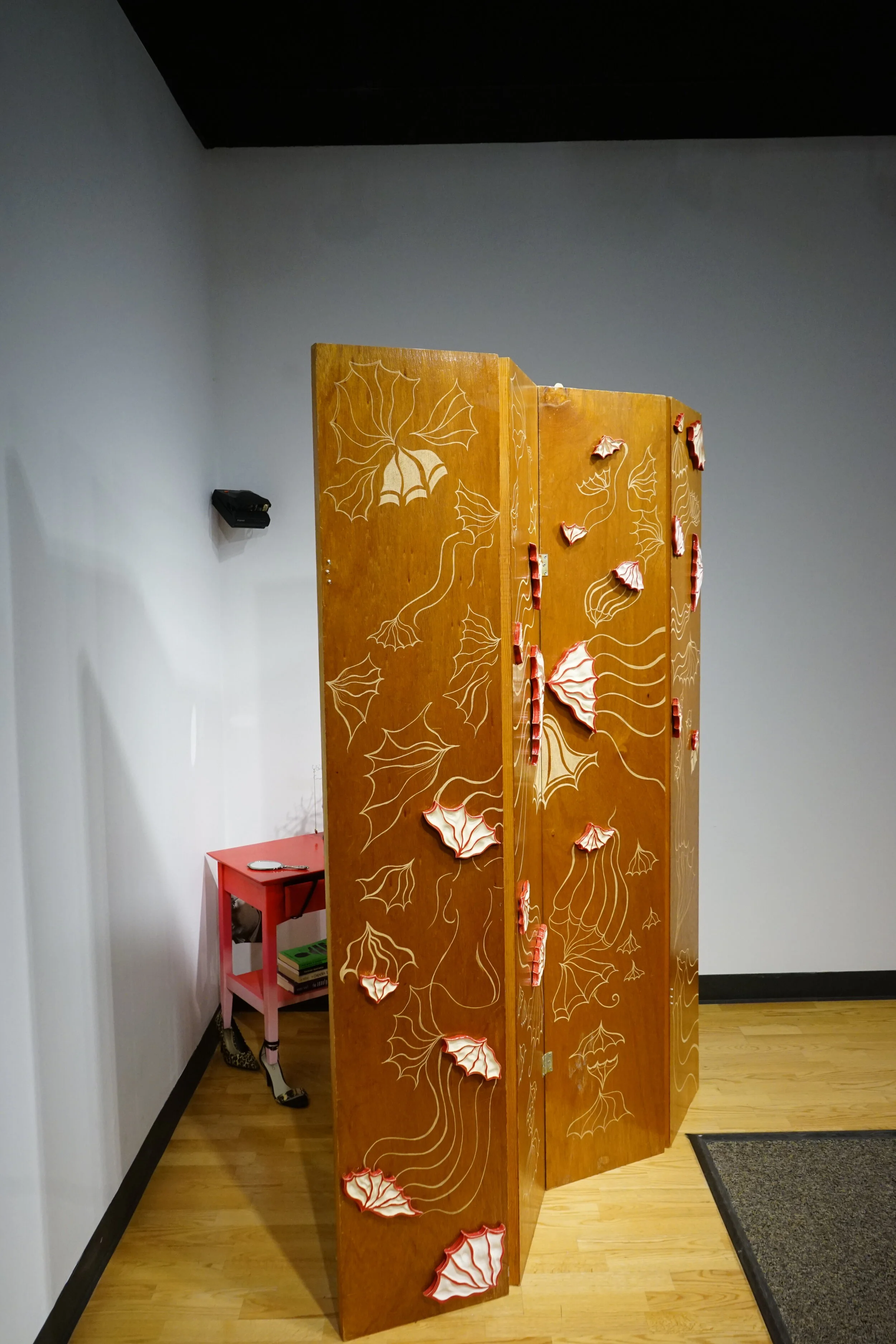 This installation divides a corner of space into a dressing room. Made from repurposed wood doors (found in the alley behind my house), the exterior features ceramic forms of femininity (skirts, ribbons, wings, flowers, parasols, shells, etc) juxtaposed with cravings of the same nature. The subtractive and additive adornments speak to the expectations projected onto women by media that they should cut away parts of themselves that are undesirable, and superficially impose elements to their appearance in the name of “beautification.”